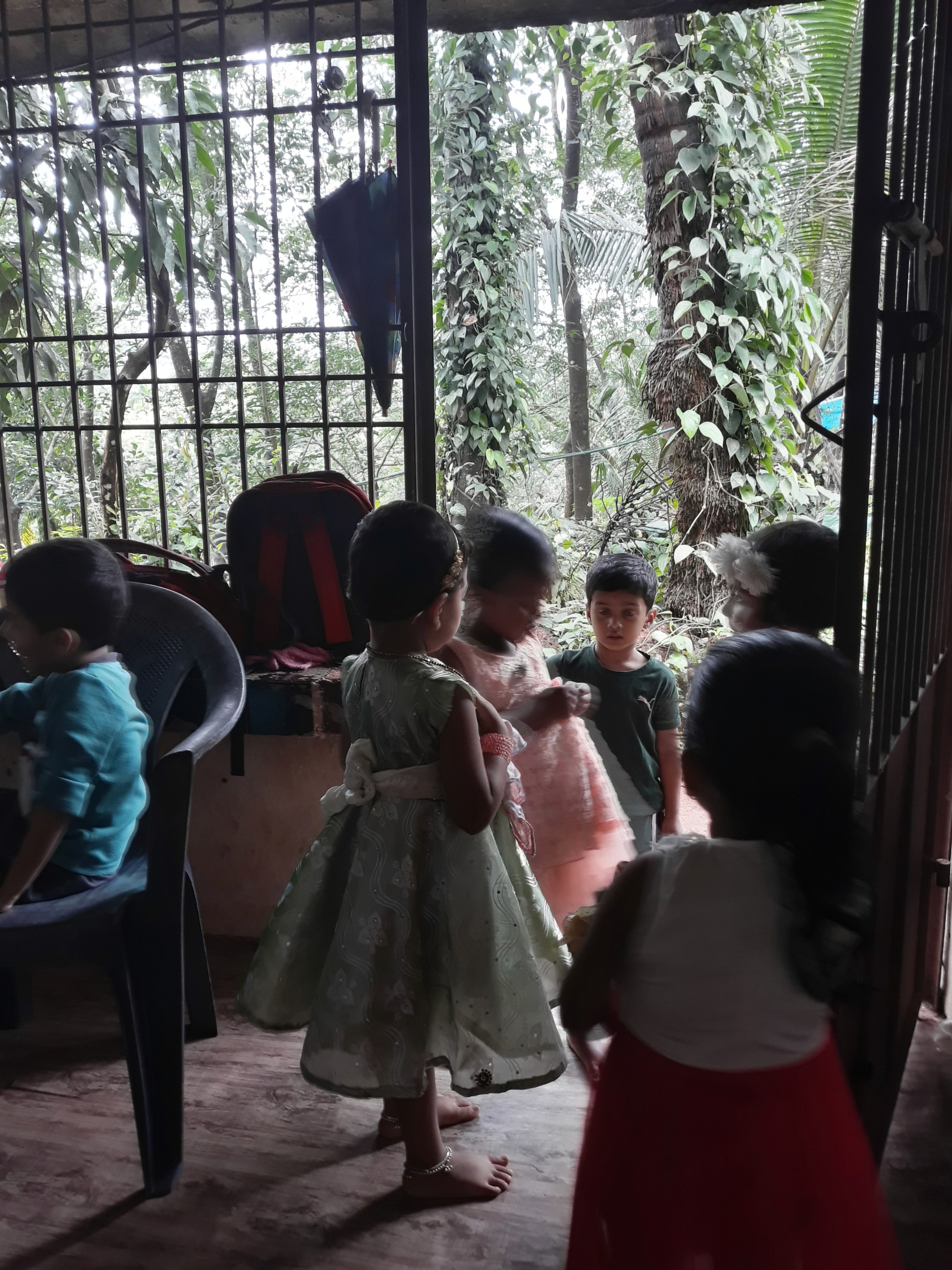 Site is located in a small town in Northern Kerala, India on the banks of a river. There are a lot of trees in and around the site. There are small to medium houses surrounding the site and the kids mostly come from houses located 1-2 kms away from the site